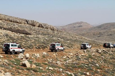 | Des véhicules de la Croix-Rouge libanaise près de la frontière syrienne le 22 avril 20 |