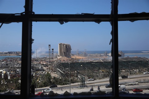 | Les restes de gigantesques silos à grans après l'explosion qui a dévasté le port de Beyrouth, au Liban. |