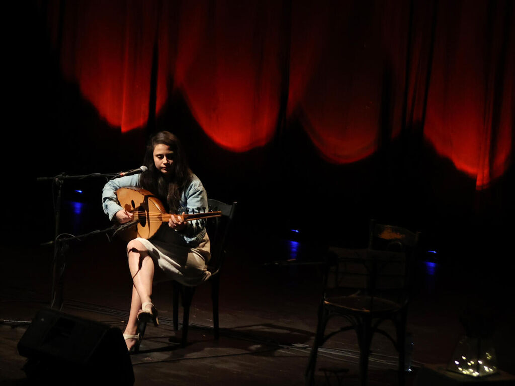 | Aline Chalvarjian, étudiante au conservatoire national de musique du Liban, joue du oud (luth) lors d'un concert au théâtre Al-Madina de Beyrouth, le 18 avril. |