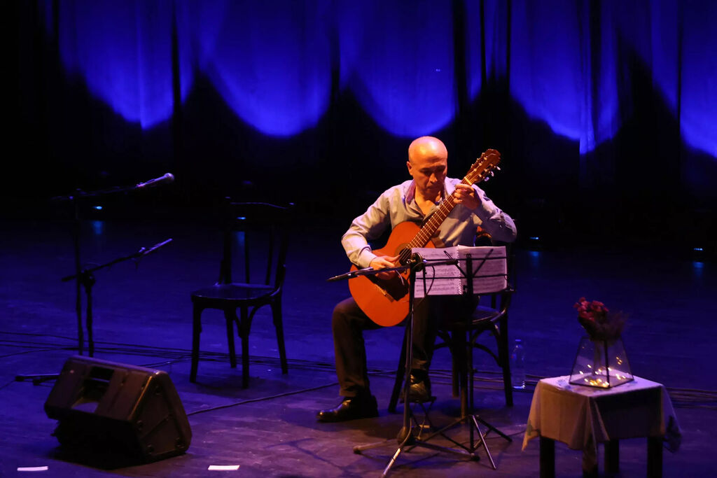 | Fadi Rashid, professeur de musique au conservatoire national du Liban, joue de la guitare lors d'un concert au théâtre Al-Madina à Beyrouth, le 18 avril. |