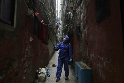 | Un volontaire désinfecte une rue du camp palestinien de Chatila, en banlieue de Beyrouth, le 24 mars. |