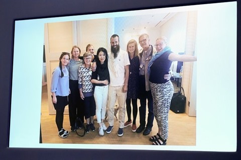 | Le Suédois Johan Gustafsson (centre) entouré par sa famille à son arrivée en Suède, sur une photo projetée lors d'une conférence de presse du gouvernement suédois, le 26 juin à Stockholm. |