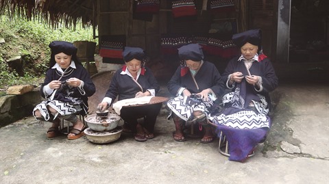 | Des femmes de l’ethnie Dao au district de Dà Bac, province de Hoà Binh (Nord), maintiennent leur métier traditionnel de broderie de brocatelle. |