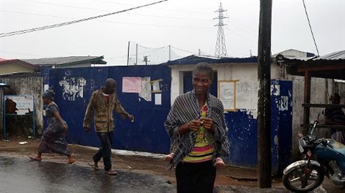 | Des passants devant l'école qui sert de centre d'isolement des malades d'Ebola, le 17 août dans un quartier de l'Ouest de la capitale Monrovia, au Liberia |