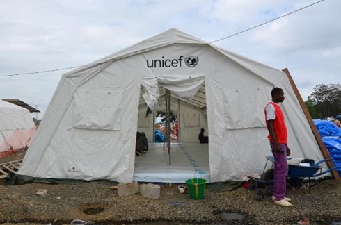 | Un homme devant une tente Unicef dédiée aux patients infectés avec le virus Ebola, le 12 août |