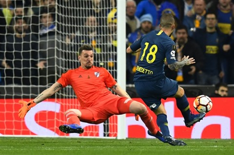 | Le joueur de Boca Juniors Dario Benedetto (droite) marque face au gardien de River Plate en finale de retour de la Copa Libertadores. |