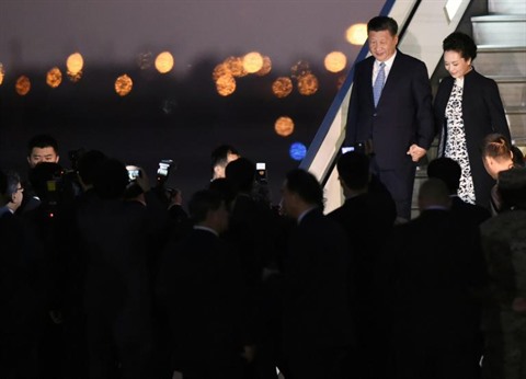 | Le président chinois, Xi Jinping, et son épouse, Peng Liyuan, arrivent à Lima, le 18 novembre. |