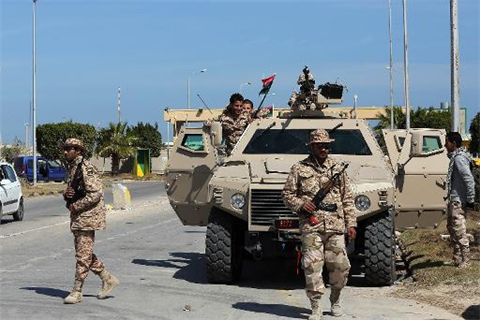 | Des membres des forces de défense libyennes près de Zouara le 4 mars 2013. |