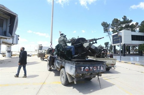 | Des forces loyales au gouvernement libyen d'union nationale sur le terrain de l'ancien aéroport international de Tripoli le 8 avril. |
