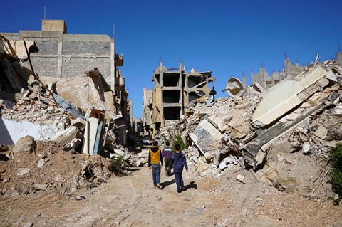 | Des garçons marchent dans la vieille ville de Benghazi en Libye. |