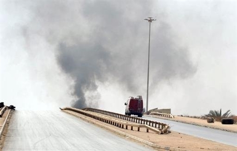 | Un véhicule sur une route déserte alors que de la fumée s'élève au loin lors de combats entre les soldats et les milices islamistes qui contrôlent Benghazi, le 15 octobre. |