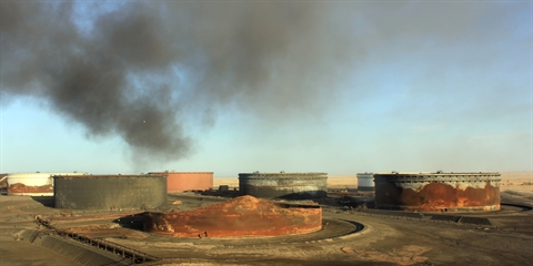 | De la fumée s'échappe de terminaux de stockage pétroliers en Libye après des combats, le 9 janvier près de Ras Lanouf |