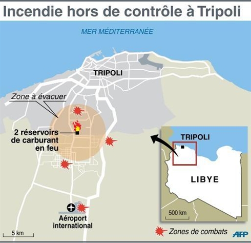 | Carte de Tripoli en Lybie avec les deux réservoirs de carburant en feu et la localisation des principales zones de combats. Photo : AFP/VNA/CVN |