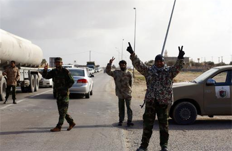 | Des combattants de la milice Fajr Libya font le signe de la victoire à Zwara, dans l'Ouest de la Libye, le 6 janvier |
