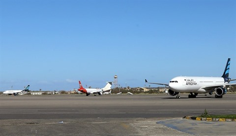 | Une photo prise le 8 avril montre des avions stationnés sur le tarmac de l'aéroport Mitiga dans la capitale libyenne Tripoli. |
