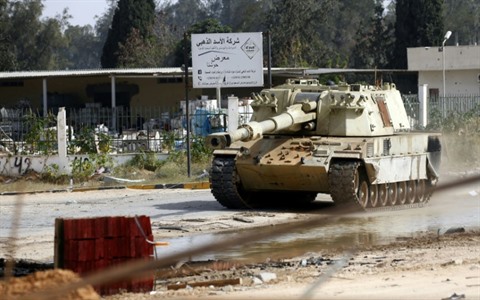 | Un char des forces du gouvernement libyen d'union nationale engagé dans des affrontements au sud de Tripoli avec les forces du maréchal Khalifa Haftar, le 20 avril. |