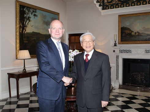 | Le secrétaire général du Parti communiste du Vietnam, Nguyên Phu Trong (droite), et le ministre britannique de la Défense, William Hague, le 23 janvier à Londres. |