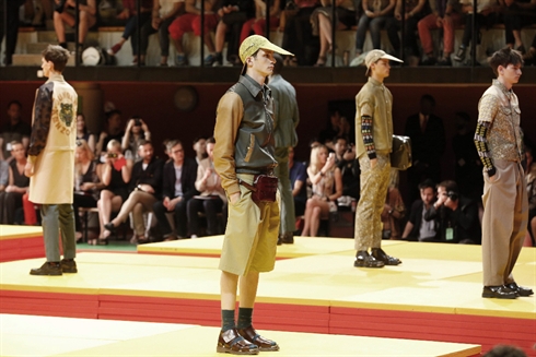 La marque Kenzo avait investi la Maison du judo à la périphérie de la capitale le 30 juin au matin, surprenant journalistes et acheteurs de grands magasins du monde entier en ouvrant le spectacle avec une dizaine d'acrobates debout sur une passerelle.