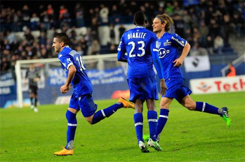 | Le milieu du SC Bastia Ryad Boudebouz (gauche), à la fête, après son but contre Rennes, le 13 décembre au stade Armand Cesari. Photo : AFP/VNA/CVN |