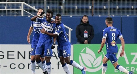 | L'attaquant Sadio Diallo (2e à gauche) exulte après avoir ouvert le score pour Bastia face à Monaco, le 17 février 2017 à Bastia. |