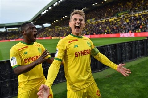 | Les Nantais Majeed Waris (gauche) et Valentin Rongier cèlèbrent le troisième but de leur équipe contre le PSG, le 17 avril à Nantes. |