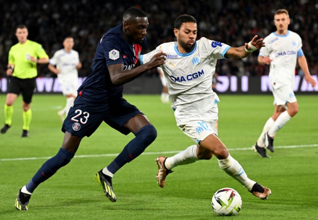 | L'attaquant du PSG, Randal Kolo Muani (gauche), à la lutte avec le défenseur de l'OM Rena Lodi, le 24 septembre au Parc des Princes. |