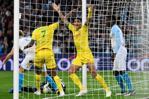 | Le défenseur de Nantes Diego Carlos (centre) buteur lors de la victoire à Marseille 2-1 en 34e journée de L1 le 28 avril. |
