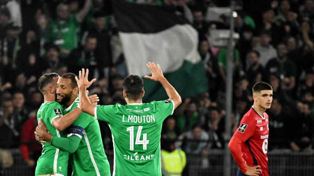| Les joueurs de l'ASSE (gauche) célèbrant leur victoire 1 à 0 en Ligue 1 contre le LOSC au stade Geoffroy Guichard à Saint-Étienne, le 13 septembre 2024. |