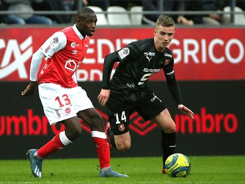 | Le milieu de Reims Hassane Kamara (gauche) devant le milieu de Rennes Benjamin Bourigeaud, le 16 février à Reims. |