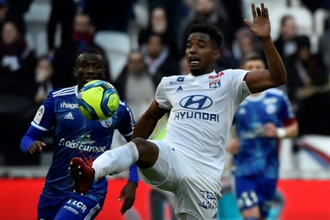 | Le milieu de Lyon Thiago Mendes (droite) devant l'attaquant de Strasbourg Kevin Zohi, le 16 février à Décines-Charpieu. |