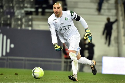 | Le gardien stéphanois Stéphane Ruffier s'apprête à passer le ballon lors du match face à Toulouse, le 29 octobre à Toulouse. |