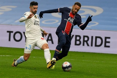 | L'attaquant brésilien du PSG, Neymar, à la lutte avec le défenseur espagnol de Marseille, Alvaro Gonzalez, le 7 février au stade Vélodrome. |