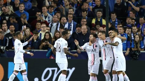 | Les joueurs du Paris Saint-Germain célèbrent le but de leur coéquipier, l'Espagnol Ander Herrera, lors du match de Ligue des champions contre Club Brugge au Jan Breydel Stadium à Bruges, le 15 septembre. |