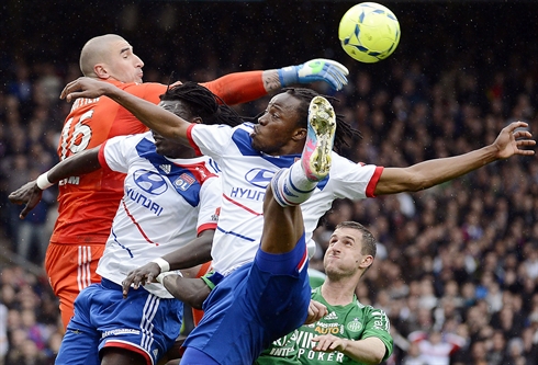 | Le gardien de but de Saint-Étienne, Stephane Ruffier (gauche), face à deux footballeurs de Lyon |