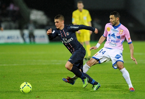 | Le milieu de terrain de Paris Saint-Germain, Marco Verratti (gauche), et son adversaire d'Evian, Cedric Barbosa, 28 avril au stade à Annecy |