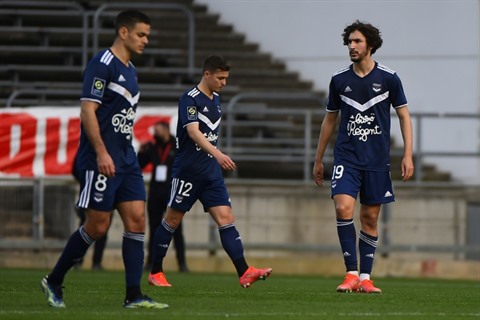 | Les joueurs bordelais, lors du match de L1, le 21 février au Stade des Costières à Nîmes. |