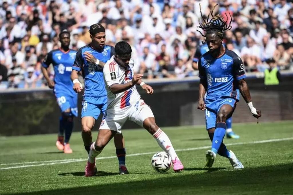 | L'attaquant de Lyon Endrick (gauche) au duel avec le joueur d'Auxerre Gideon Mensah, lors du match de Ligue 1 remporté par l'OL, le 25 avril, à Décines-Charpieu. |