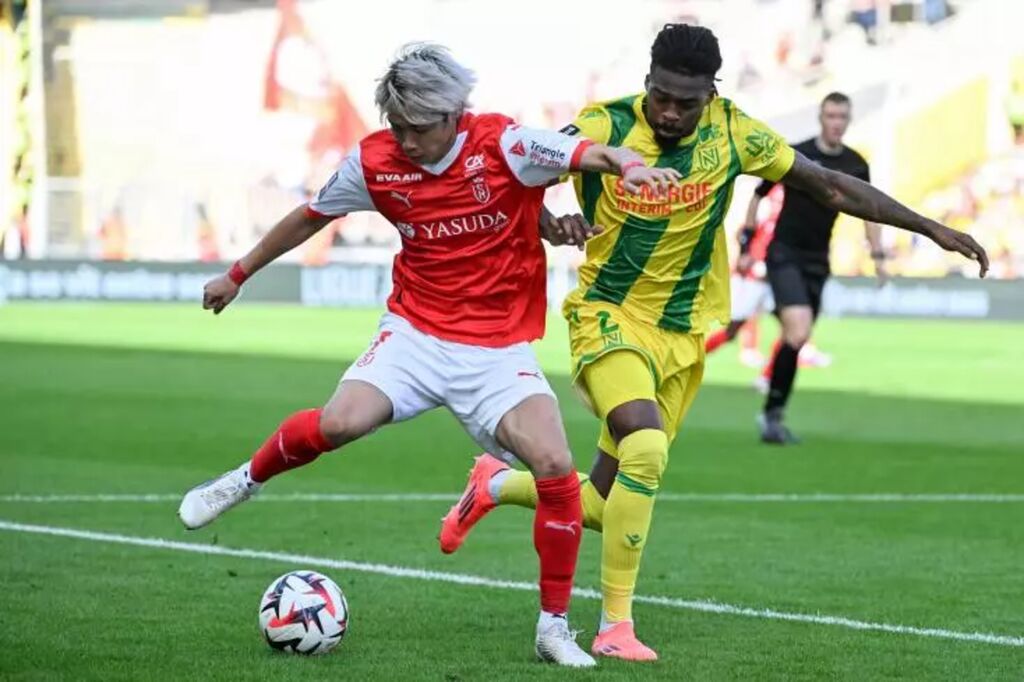 | L'attaquant japonais de Reims Junya Ito (gauche) devant le défenseur nantais Jean-Kevin Duverne, le 15 septembre à Nantes. |