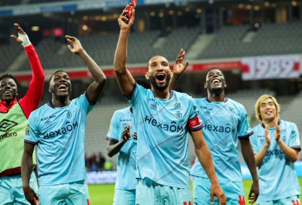 | Le défenseur de Reims, No5 Yunis Abdelhamid, et ses coéquipiers fêtent leur victoire 2-1 contre Lille en L1 au stade Pierre-Mauroy de Villeneuve-d'Ascq, le 26 septembre. |