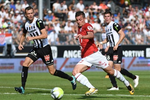 | L'attaquant de Lille Nicolas De Préville (centre) auteur du but de l'égalisation pour Lille face à Angers, le 27 août à Angers. |