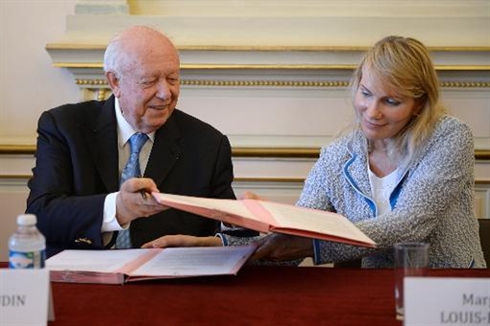 | Le maire de Marseille, Jean-Claude Gaudin (UMP), et la propriétaire de l'Olympique de Marseille, Magarita Louis-Dreyfus, signant l'accord de location du Vélodrome, le 31 juillet à Marseille. Photo : AFP/VNA/CVN |