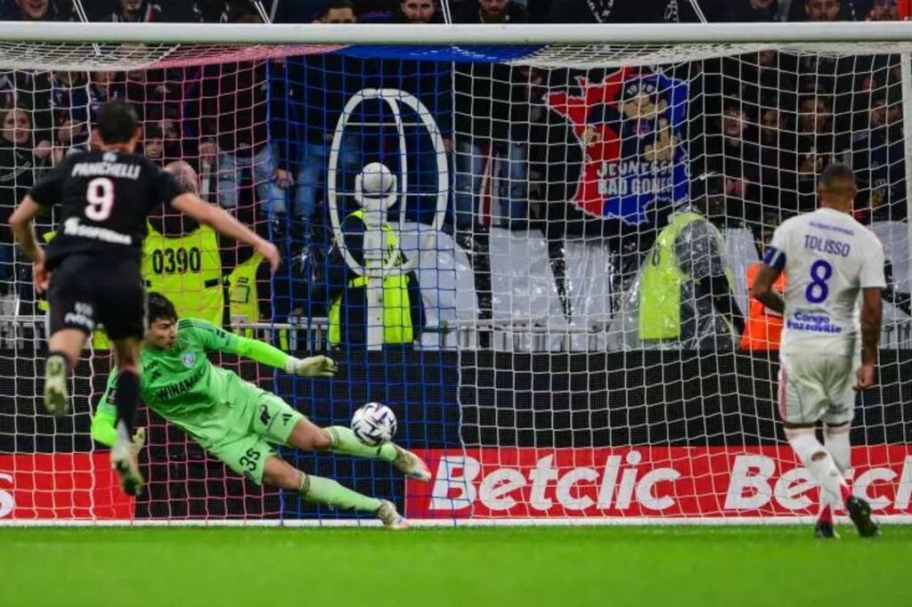 | Le gardien de Strasbourg Mike Penders arrête le penalty du capitaine lyonnais Corentin Tolisso, le 26 octobre à Décines-Charpieu. |