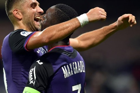 | L'attaquant ivoirien de Toulouse Max-Alain Gradel (droite) célèbre son but sur penalty avec son coéquipier, l'attaquant grec Efthymios Koulouris, lors de la victoire face à Lille, le 19 octobre à Toulouse |