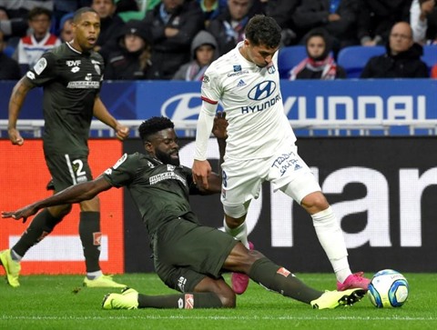 | Le défenseur gabonais de Dijon Bruno Ecuele Manga (gauche) à la lutte avec le milieu français de Lyon Houssem Aouar lors d'un match de Ligue 1 au Groupama stadium, le 19 octobre |