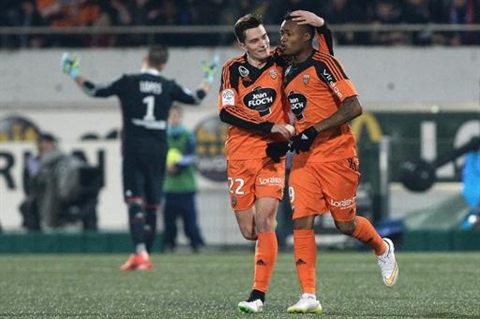 | L'attaquant de Lorient Jordan Ayew (droite) félicité par son coéquipier Benjamin Jeannot après son but contre Lyon, le 15 février au Moustoir. |