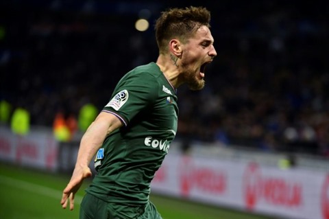 | Le défenseur de Saint-Étienne, Mathieu Debuchy, vient de marquer face à Lyon au Parc OL, le 25 février en championnat de Ligue 1. |