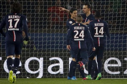 | Les joueurs du PSG autour de Zlatan Ibrahimovic, auteur d'un triplé contre Lorient, le 20 mars au Parc des Princes à Paris. |