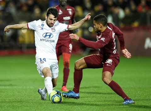 | Le défenseur de Lyon Léo Dubois (gauche) face au défenseur de Metz Mathieu Udol, le 21 février à Longeville-lès-Metz. |