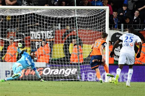 | Le milieu montpelliérain Paul Lasne (N°17) ajuste Steve Mandanda pour le 2e but de son équipe, le 9 janvier au stade de la Mosson. |