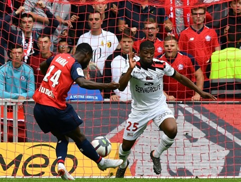 | L'attaquant lillois Jonathan Bamba (gauche) inscrit l'un de ses deux buts contre Guingamp à Villeneuve-d'Ascq, le 26 août. |
